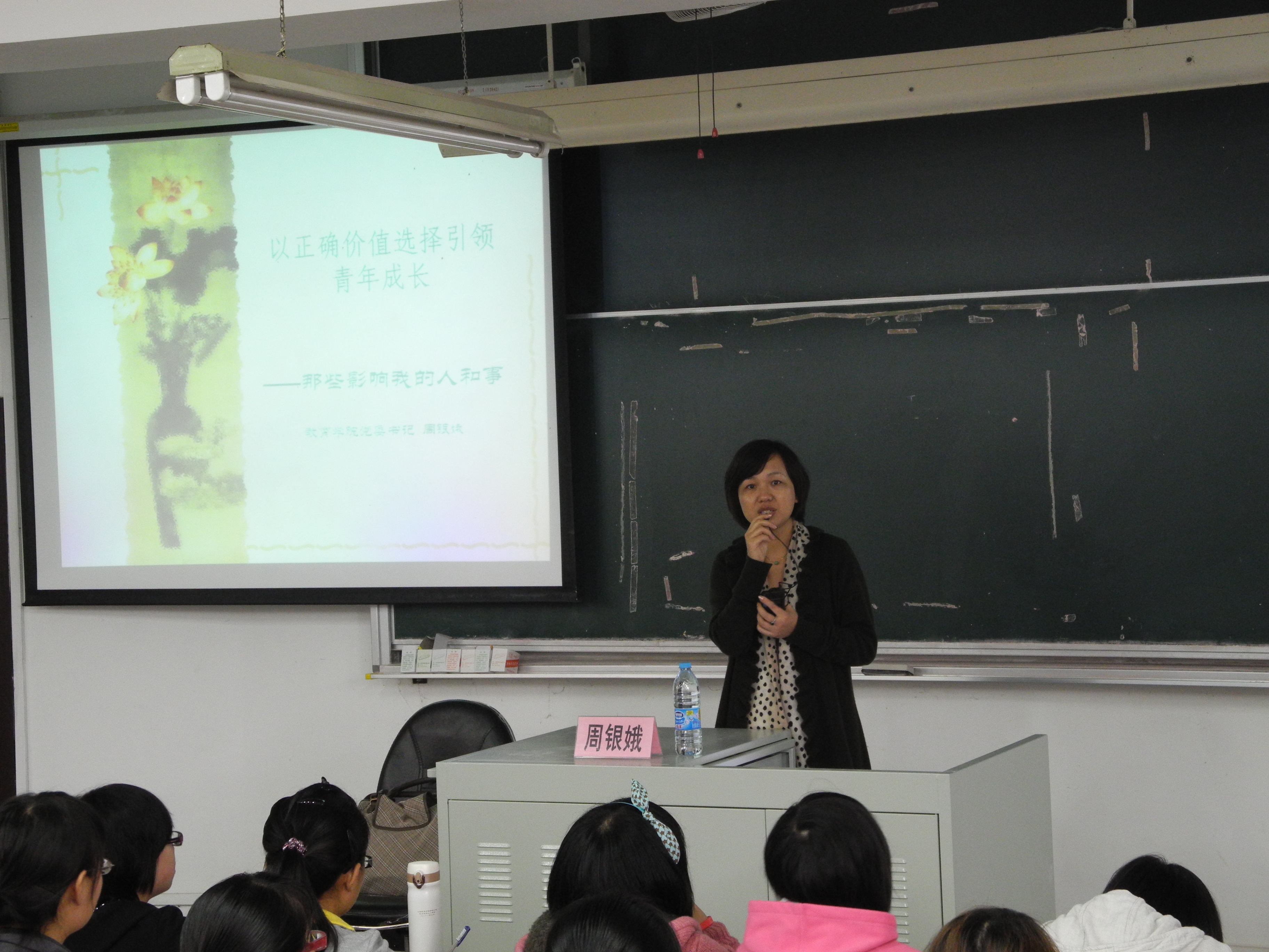 周书记首先为同学们讲述了曾经对她有着深刻影响的人和事。她以亲身经历告诉同学们一个道理:入党是青年自身成长的需要;若要成为一名学生党员,需要不断历练,乐于奉献、勇于担当。周书记又谈到,那些曾经对她有过深刻影响的师长和同事,那些拥有着踏实、宽厚、执着、坚韧品质的人都拥有一个共同的名字:共产党员。而正是这些价值的选择促使她坚定地选择了加入中国共产党。随后,周书记谈到了“青年人选择入党是党和国家事业建设和发展的需要。在新的历史阶段,需要我们青年一代去承担新的使命与责任。”最后,周书记指出,一名共产党员要“仰望星空,脚踏实地”,要做出正确的价值选择。