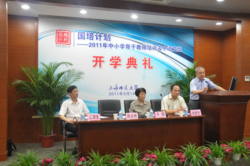 914日,国培计划――2011年中小学骨干教师培训高中语文班在上海师范大学隆重开班。来自上海、安徽、河南等三省50多名高中语文语文骨干教师将参加为期15天的培训。语文教育专家、全国教书育人楷模――于漪老师,上海师范大学教育学院院长陈永明教授,高中语文研修班首席专家王荣生教授出席了开班典礼。会议由教育学院徐雄伟副院长主持。