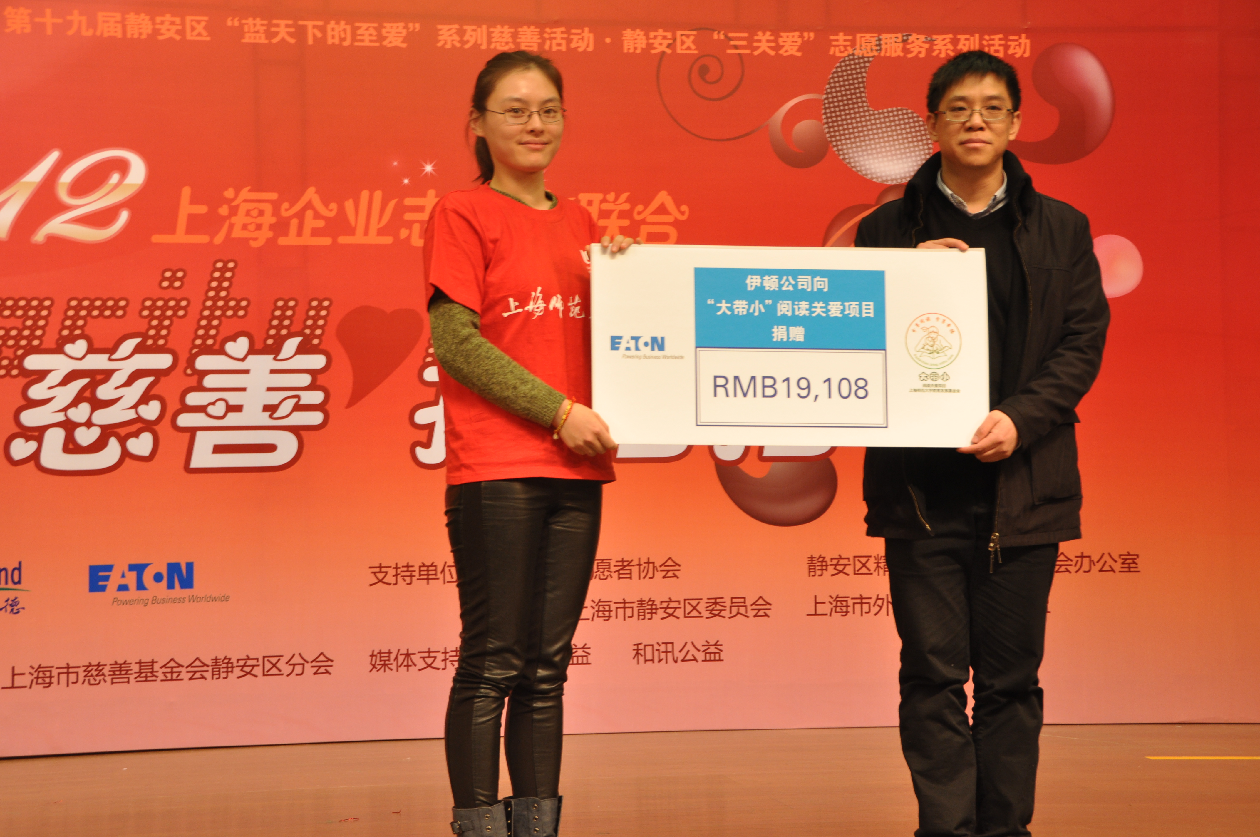 2012128,我院“大带小”儿童课外阅读关爱项目,在2012上海企业志愿者联合“慈善拍拍拍”活动上,获得世界五百强伊顿公司捐赠善款近2万元。