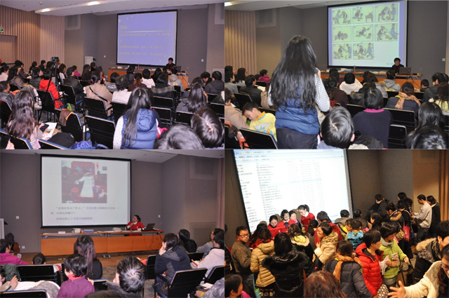 图为“大带小”团队2013年12月在浦东图书馆举办公益讲座《让孩子爱上阅读——互动式分享阅读指导》,吸引了广大小读者和家长前来聆听,并积极与志愿者们互动。