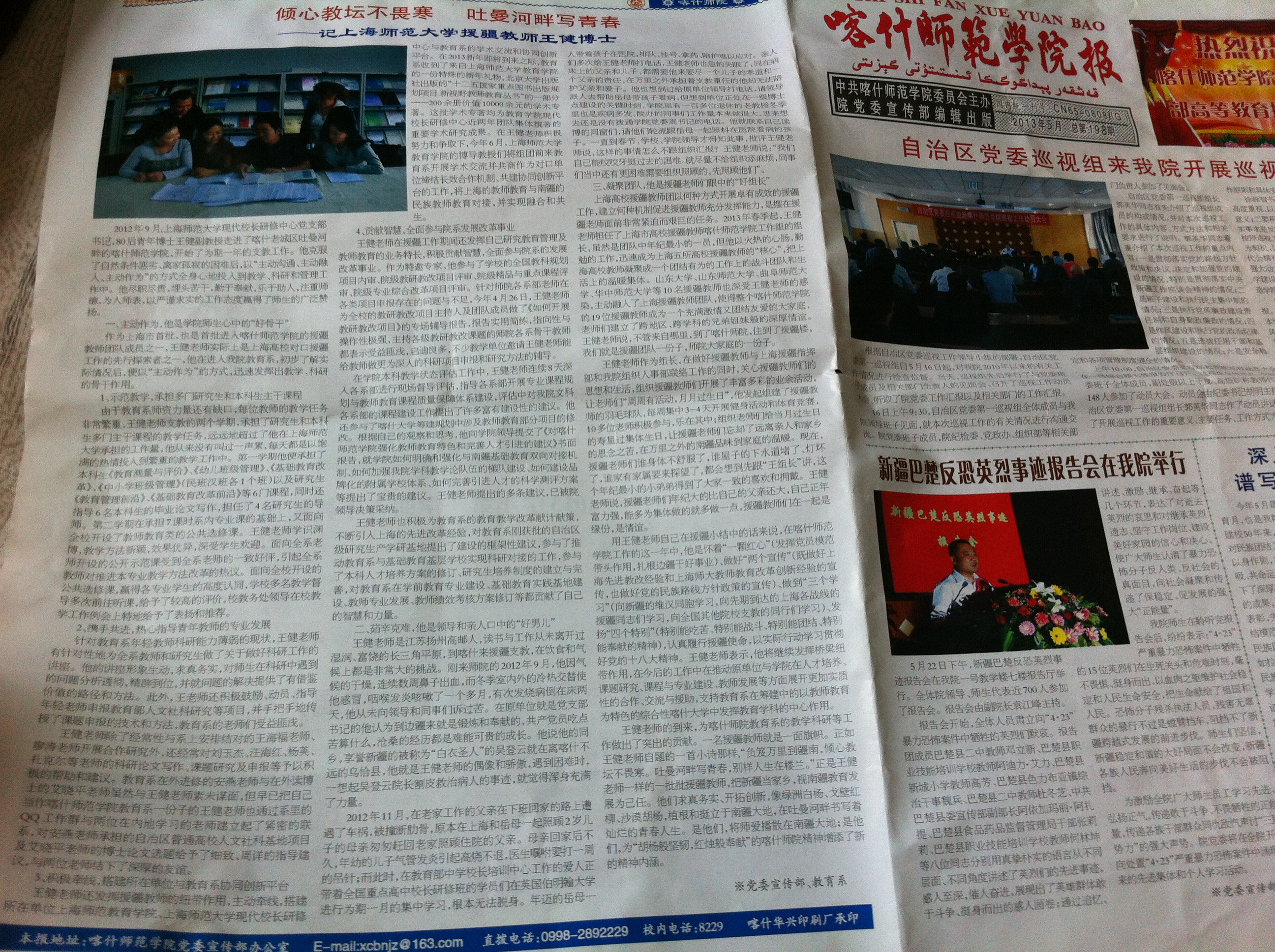 日前,作为从2012-2013年度在喀什师范学院援疆支教的28位内地高校教师中选出的唯一典型,2013年5月刊的《喀什师范学院报》第四版以“倾心教坛不畏寒、吐曼河畔写青春”为题,以整版的篇幅大幅宣传报道了我院选派的援疆支教教师王健副教授的事迹。