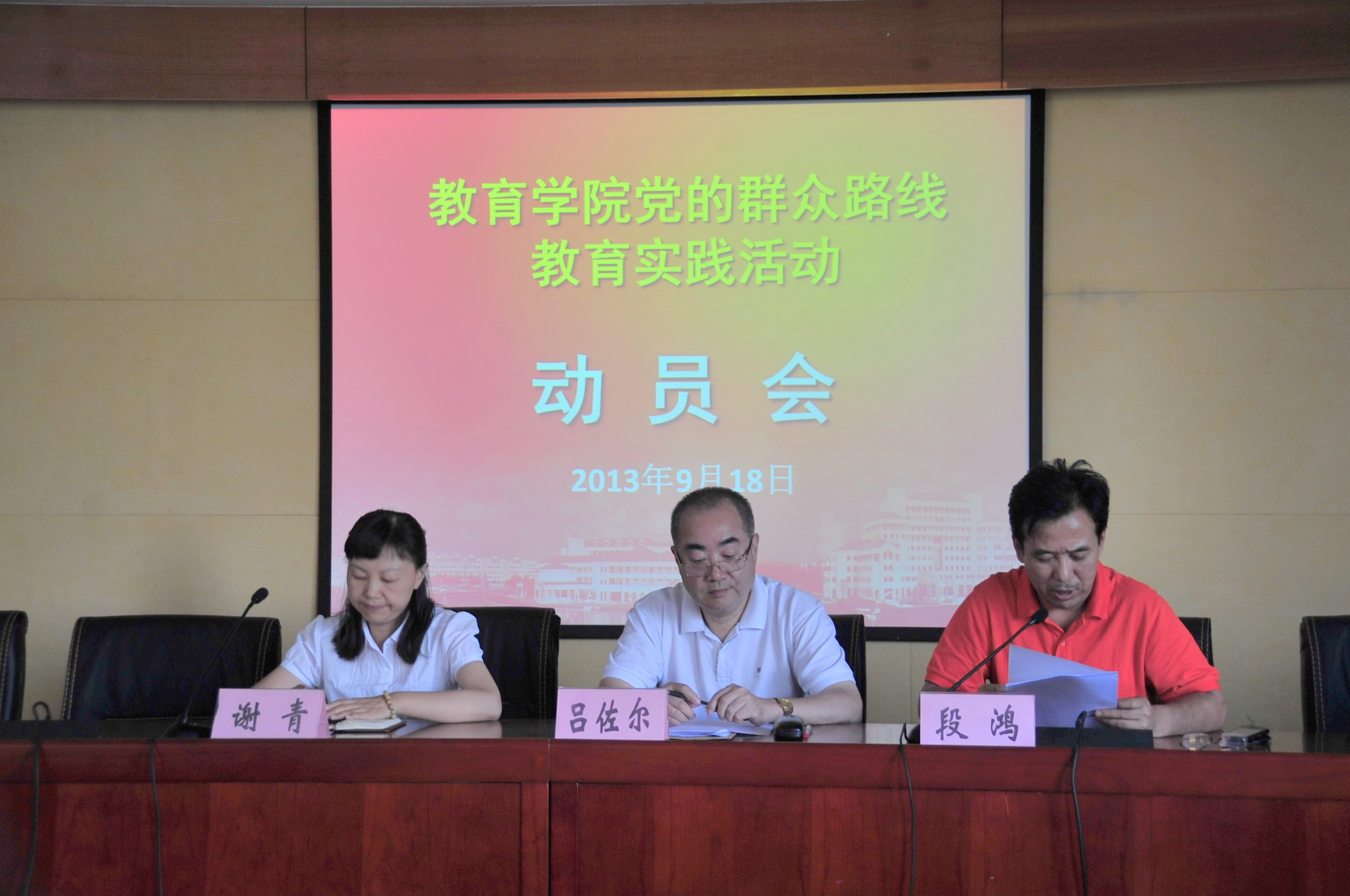 9月18日下午,教育学院召开党的群众路线教育实践活动动员大会。校党的群众路线教育活动第四督导组领导吕左尔作督导讲话。党委副书记、学院党的群众路线教育领导小组组长段鸿作了题为“正确认识重大意义,深入领会精神实质,明确把握目标任务,切实加强组织领导,确保我院群众路线教育活动取得实效”的动员报告。学院党委副书记谢青主持会议。