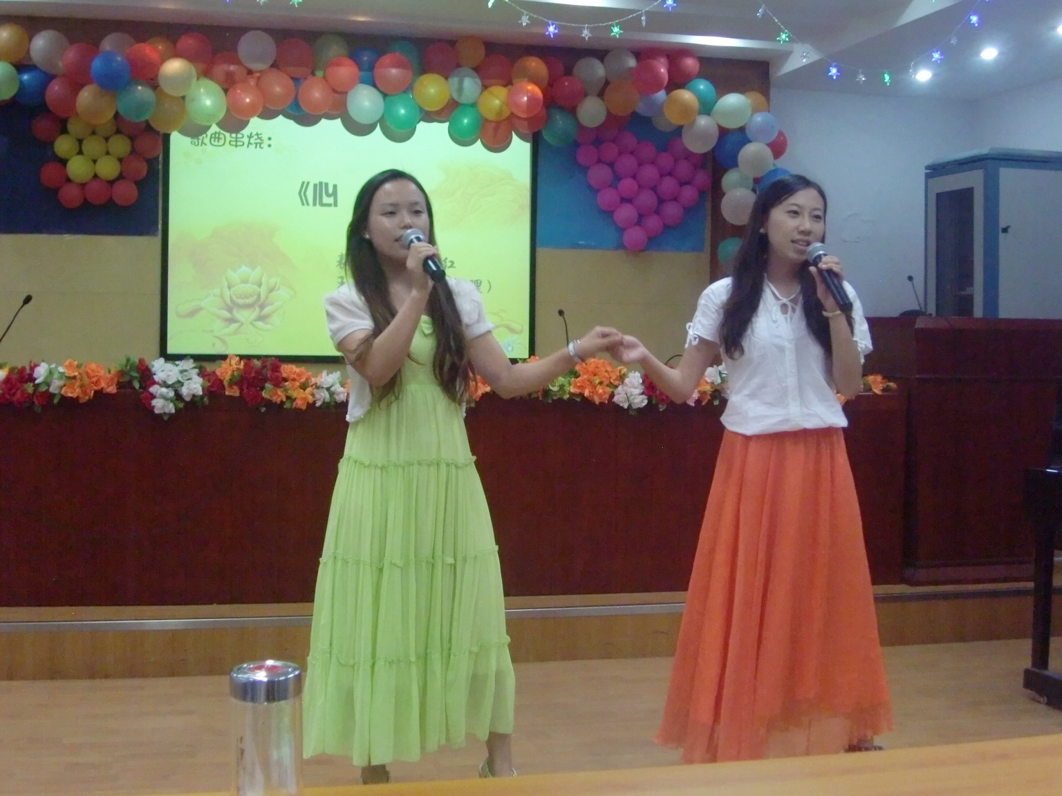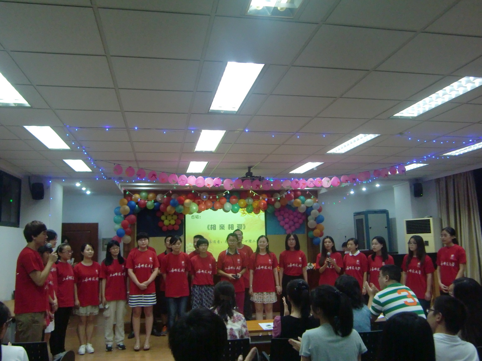茶话会在充满激情的“啦啦操”的表演中拉开序幕,这是研二学生为了迎接新生特别奉送的舞蹈,赢得了现场的阵阵掌声。此后一个个精彩的节目呈现在观众面前:诗朗诵——《月圆中秋,梦圆师大》让人觉得温馨和感动;独唱——《恋爱ing》点热全场的气氛;手语歌曲《一手“心”歌》和相声《三句半》以全新的形式,让人觉得眼前一亮;几首歌曲的串烧引发了全场的大合唱。《新闻联播·中秋特辑》和《屌丝男士》这两个小品更是笑点连连,将晚会气氛推到了最高潮。