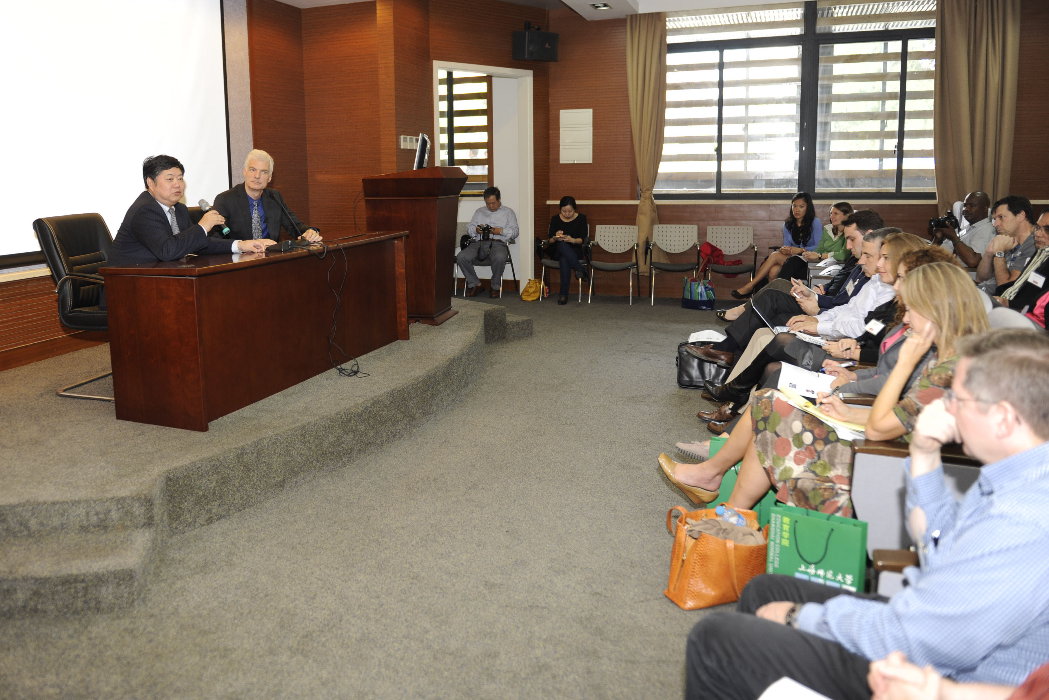10月20日,张民选校长在徐汇校区接待了Teach For All一行成员。下午一点半,受Teach For All 首席执行官温迪﹒库珀(Wendy Koop)的邀请,张民选校长在东部校区第四教学楼101报告厅给“Teach For All” 旗下来自全球28个国家的机构发起人、支持者及理事会成员做了一场主题为“上海基础教育成功经验”的专题分享讨论会。讨论会由经合组织(OECD)教育与技能发展处负责人,PISA项目设计、推广者安德烈亚•施莱歇(Andreas Schleicher)先生主持,讨论会以主持人提问,张校长一一回应的方式进行。讨论会持续了长达一个半小时,张校长从上海学生PISA测试的卓越表现、上海中小学教师专业发展特色以及上海教育均衡发展等方面深入浅出地回答了上海基础教育成功的奥秘并引发了与会者热烈的反响。