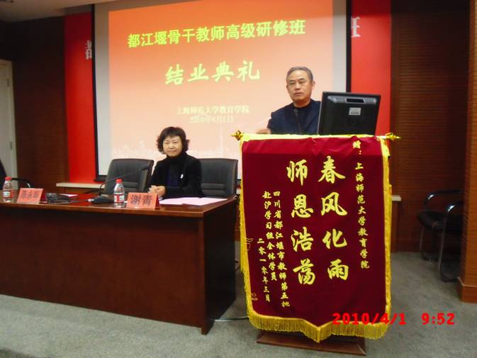 结业典礼上,来自都江堰的三位学员代表陈忠、李影嫣和董建分别进行了热情洋溢的发言。他们纷纷表达了对上海市教委、上海师范大学和教育学院的感谢;在为期一个月的培训中,他们为教育学院的专家们精彩的演讲、渊博的知识、独到的见解而深深折服;更为来自教育学院的领导