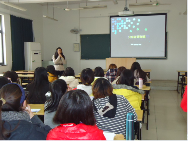 金晶晶老师2009年毕业于我院小学教育专业,现于上海世界外国语小学任教。讲座一开始金老师就让同学们见证了她大学四年到为人师表的蜕变,在教师必要素质的命题中,她与同学积极交流互动,谈笑风生间透露出对教育事业的热爱和对同学们的期许。之后,她为同学系统讲述了作为一名教师的日程安排,在教书育人外,还要组织课外活动和联系家长,即使压力来自各方各面,但压力本身也是动力,自己对于事业的热情工作中的快乐而有增无减。她积极面对事业的态度感染了在场的每一位学生,让学生们对自己的专业充满信心。在分享了自己任教以来的烦恼和有趣的事例并且分享视频之后,本次讲座也逐渐接近尾声。在最后的总结中,金老师对在场的学生们提出“Do not stop thinking,and express yourself well”的要求,再次表达了对在场即将成为教育工作者的学生们的信心。