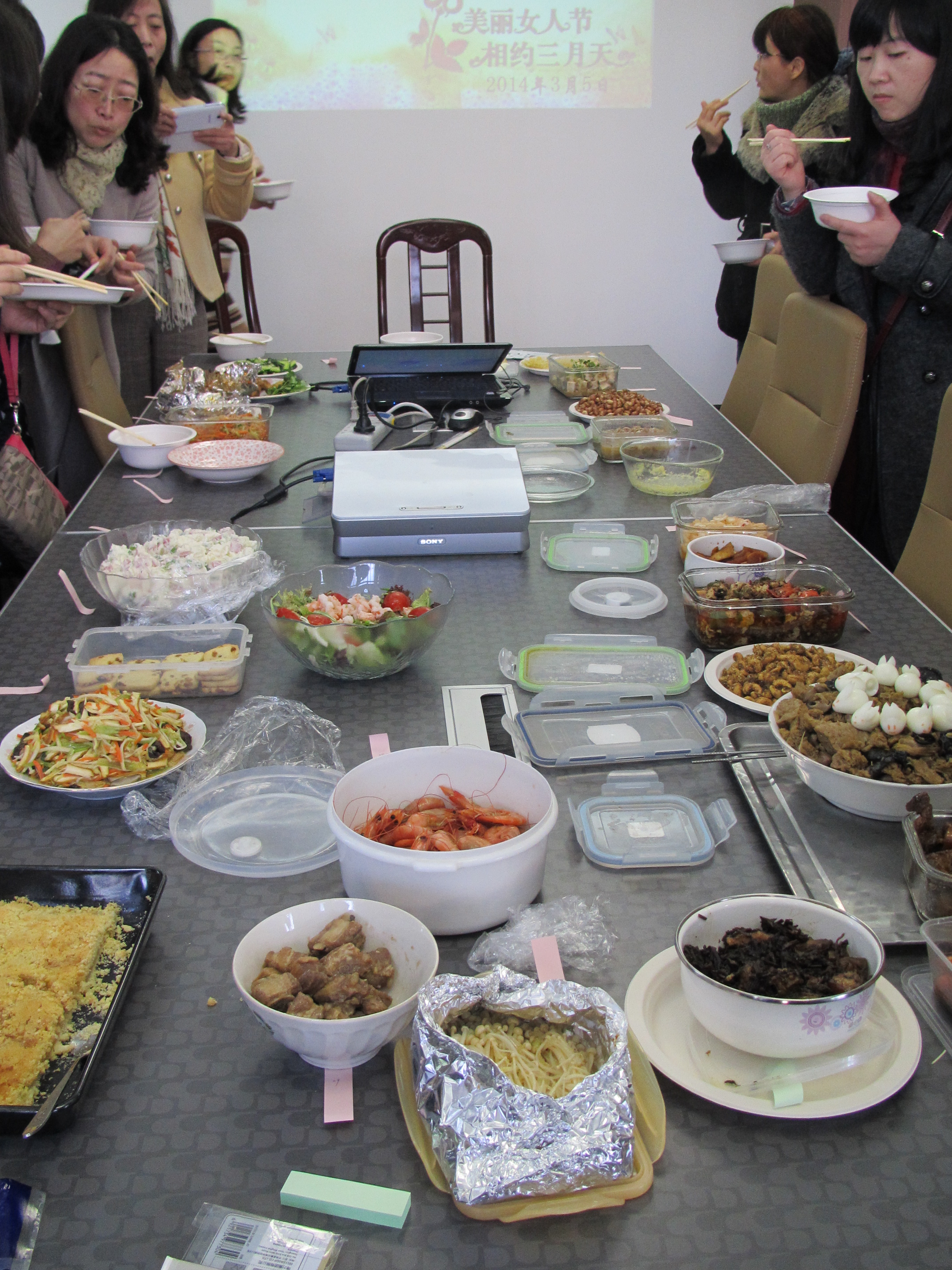 在厨艺分享会上,老师们欢聚一堂,其乐融融。近30名老师带来了自己精心准备的菜肴点心。既有梅干菜扣肉、油爆河虾等传统小菜,也有苹果派、烤饼干等西式甜点;既有糖醋小排、烤麸、糟虾等本帮菜,也有家乡咸鱼干、黄焖麂子肉等各地风味;既有老干妈烤鸡翅、啤酒红烧肉等创新菜,也有水果色拉、怪味腰果、凉拌三丝等开胃菜。从本帮菜的浓油赤酱到川湘风味的麻辣咸香,几十道色香味俱全的美味佳肴集中展示,诱人食欲。