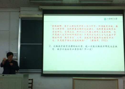 在报告中,夏正江教授首先围绕“中学教师职前培养的课程逻辑”这个报告主题介绍了相关研究背景;其次,提出由于中学教师职前培养具有的特殊性及其固有的局限性,师范院校应该大幅度提高教育类课程比例的主张是不切实际、论据不足的。再次,在简要论述教育类课程的数量逻辑基础上,详细论证了教育类课程的质量逻辑。本着教育类课程的开设不在于数量多,而在于质量精的原则,夏正江教授认为,教育类课程不只是满足教师最基本的工作需求,更重要的是要为师范生日后的可持续发展打下全面、均衡、扎实的基础。最后,由于时间关系,对于如何进一步改进教育类课程的具体建议,夏教授欢迎有兴趣的同学阅读他的相关论文。