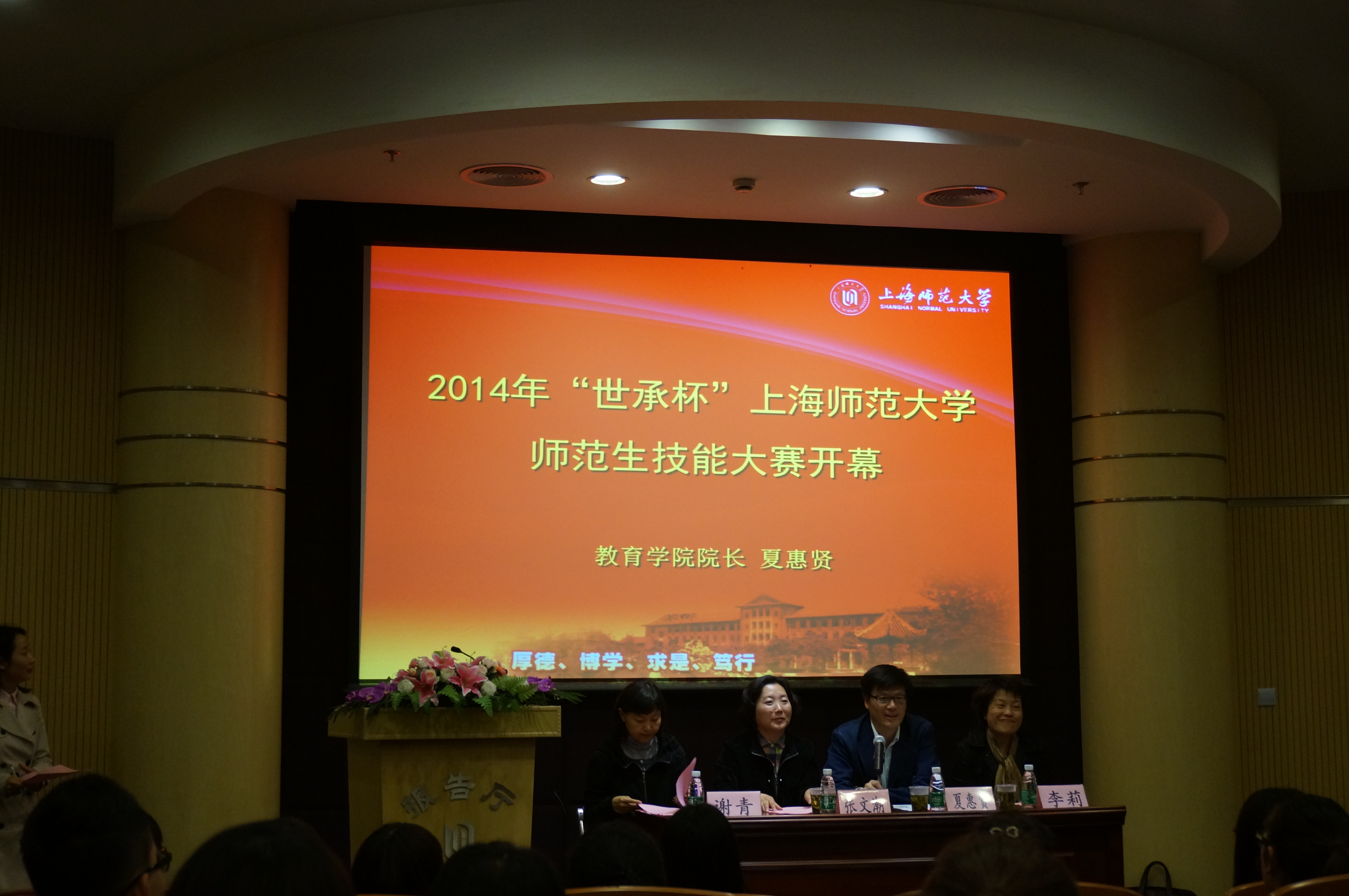 2014年4月23日晚6:30,由校学工部、教务处主办,我院主要承办的2014年“世承杯”上海师范大学师范生技能大赛开幕式在我校奉贤校区图书馆二楼报告厅隆重举行。学生工作部(处)长张文潮老师,教育学院院长夏惠贤老师,教育学院副书记、副院长谢青老师,首届上海市中小学班主任工作室负责人、全国模范教师李莉老师出席开幕式。