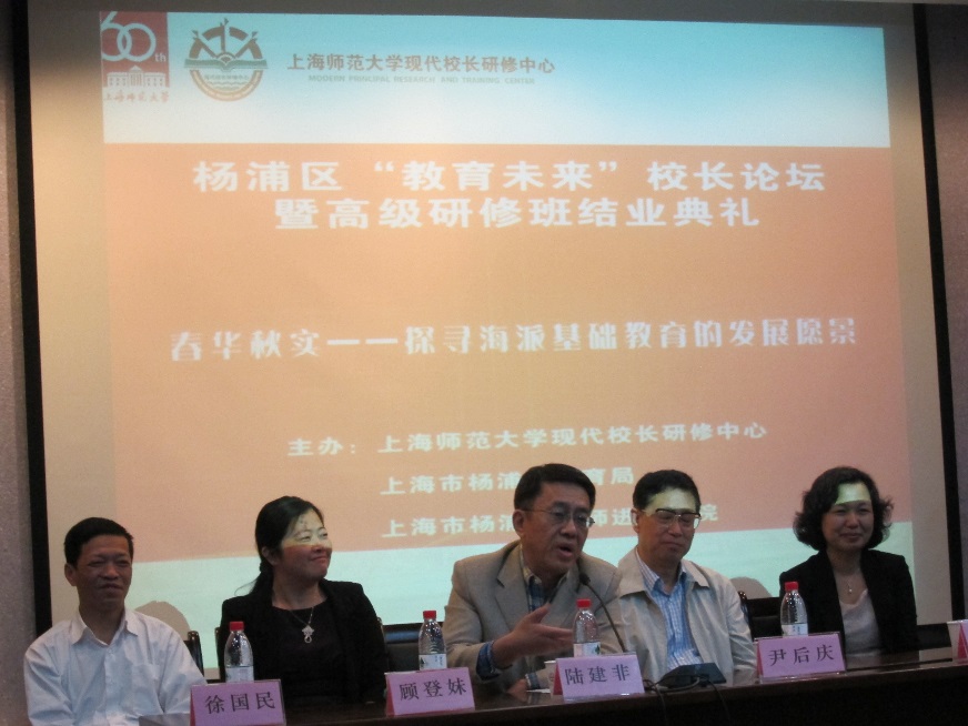 2014年10月16日下午,上海师范大学现代校长研修中心主办了60周年校庆系列活动之杨浦区“未来教育”校长论坛暨高级研修班结业典礼。上海师范大学党委书记陆建非、上海市教育委员会巡视员尹后庆、上海市杨浦区教育局党委书记顾登妹、上海市杨浦区教师进修学院院长徐国民、上海师范大学教育学院党委书记周银娥莅临活动现场,对高级研修班的校长们提出了殷切期望,希望携手教育一线的校长们一起致力于海派基础教育的发展。