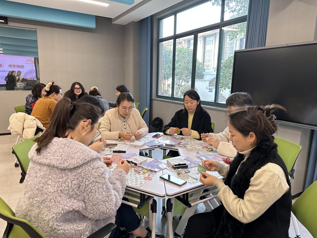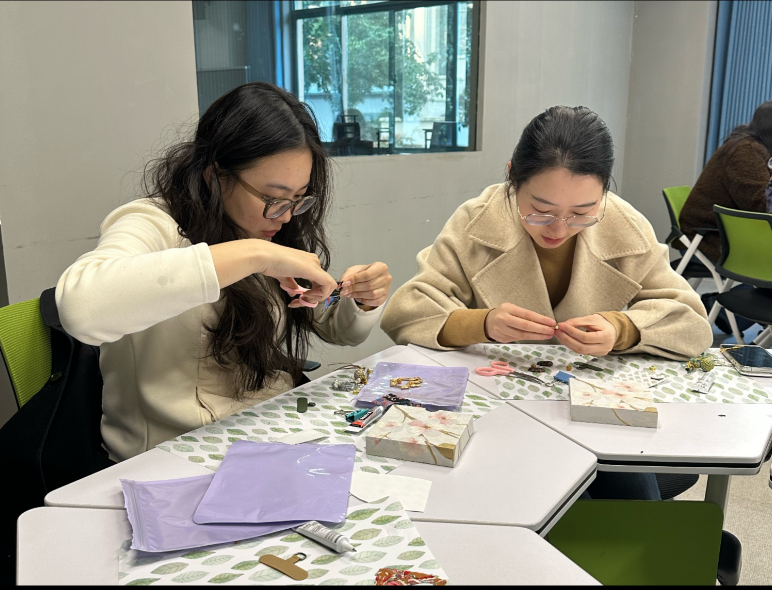 活动进入动手实践环节后,现场氛围热烈活跃。女教职工们精心挑选心仪花色的宋锦面料,手持工具全身心投入创意制作之中。裁剪时凝神专注,拼接时反复琢磨,串珠时巧思点缀。大家还相互交流制作技巧、探讨搭配方案、分享创意灵感。在彼此协作与互动中,一块块素雅精美的宋锦面料逐渐变身为独具风格、小巧玲珑的宋锦饰品。现场欢笑声、讨论声交织,勾勒出一幅温馨和谐的春日美好图景。